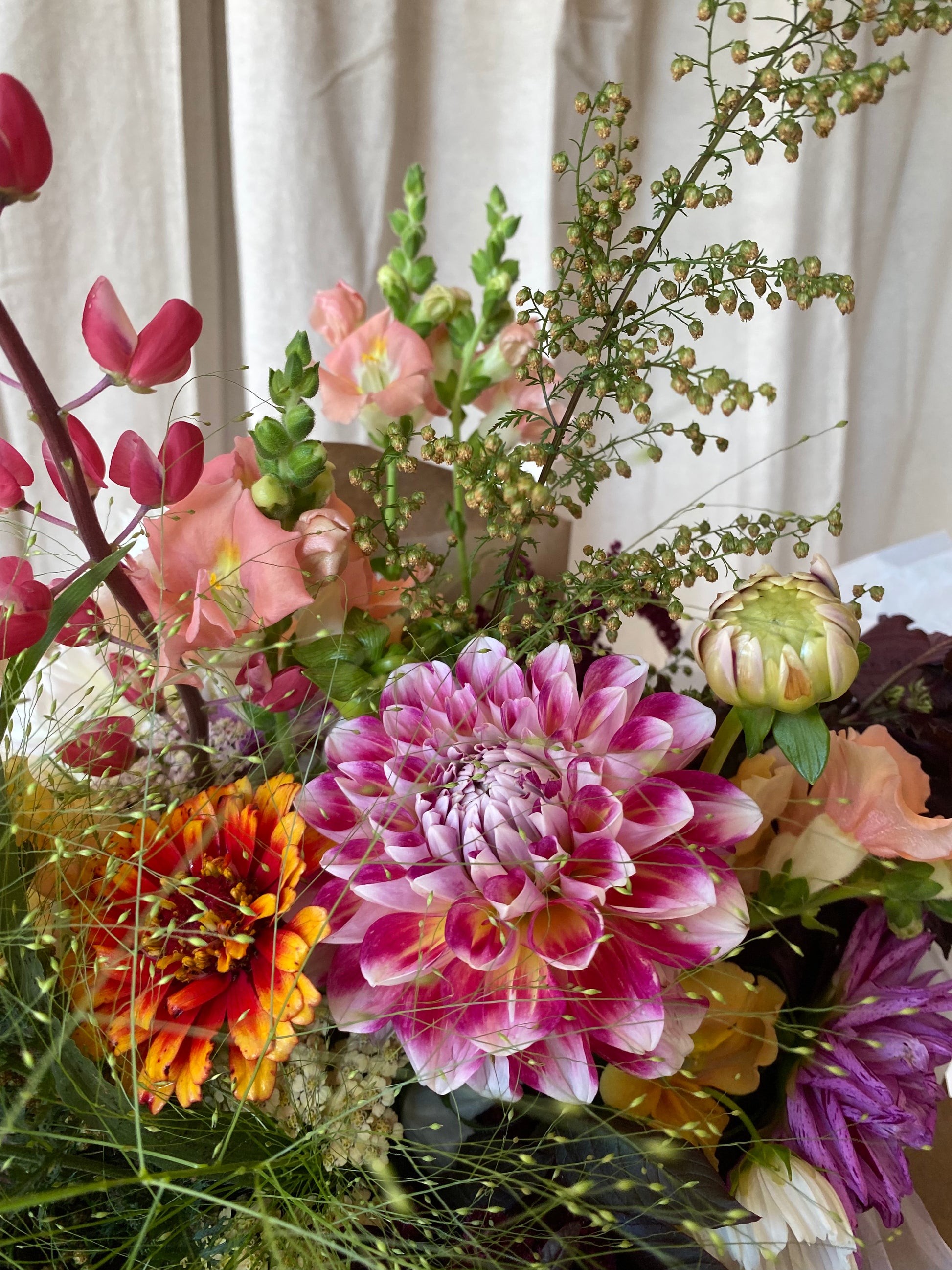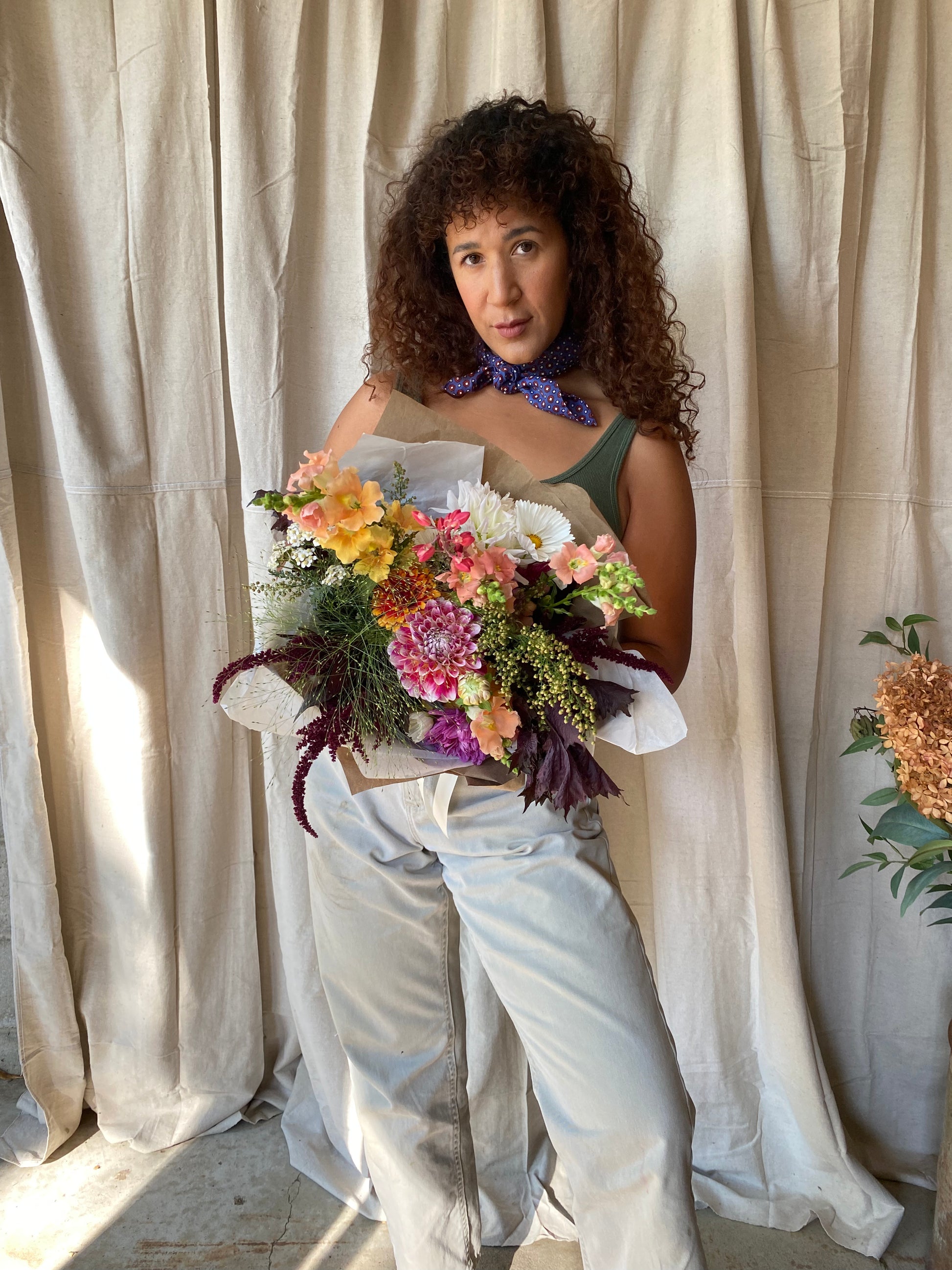 This product is hand tied and wrapped in paper. Colors, style, and blooms will be at the designer's discretion unless agreed upon in correspondence prior to delivery. Please email "must have" requests or any customizations prior to placing an order. You can email nirifisher@gmail.com.