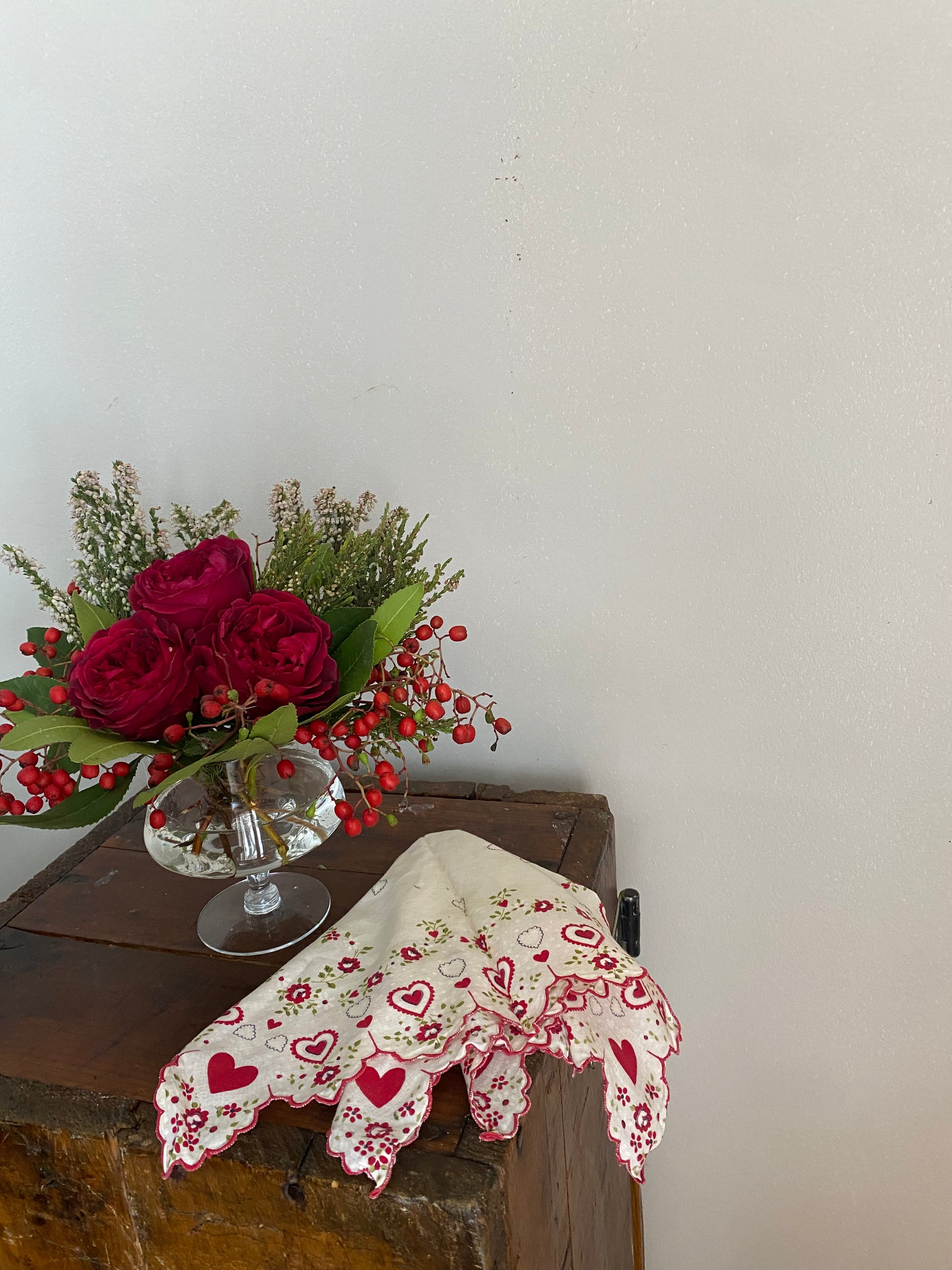 NIRA VIDA offers a harmonious color palette, texture, and a multitude of varieties in each of your floral arrangements. "Piédestal" is a celebration of your love on Valentine's Day or any other day. This is a curated and pre loved vessel and only TWO are in stock Florals are styled as suggested and would be freshly ordered for your date. For Valentine's day we are including a one of a kind vintage hankie similar to that pictured here.